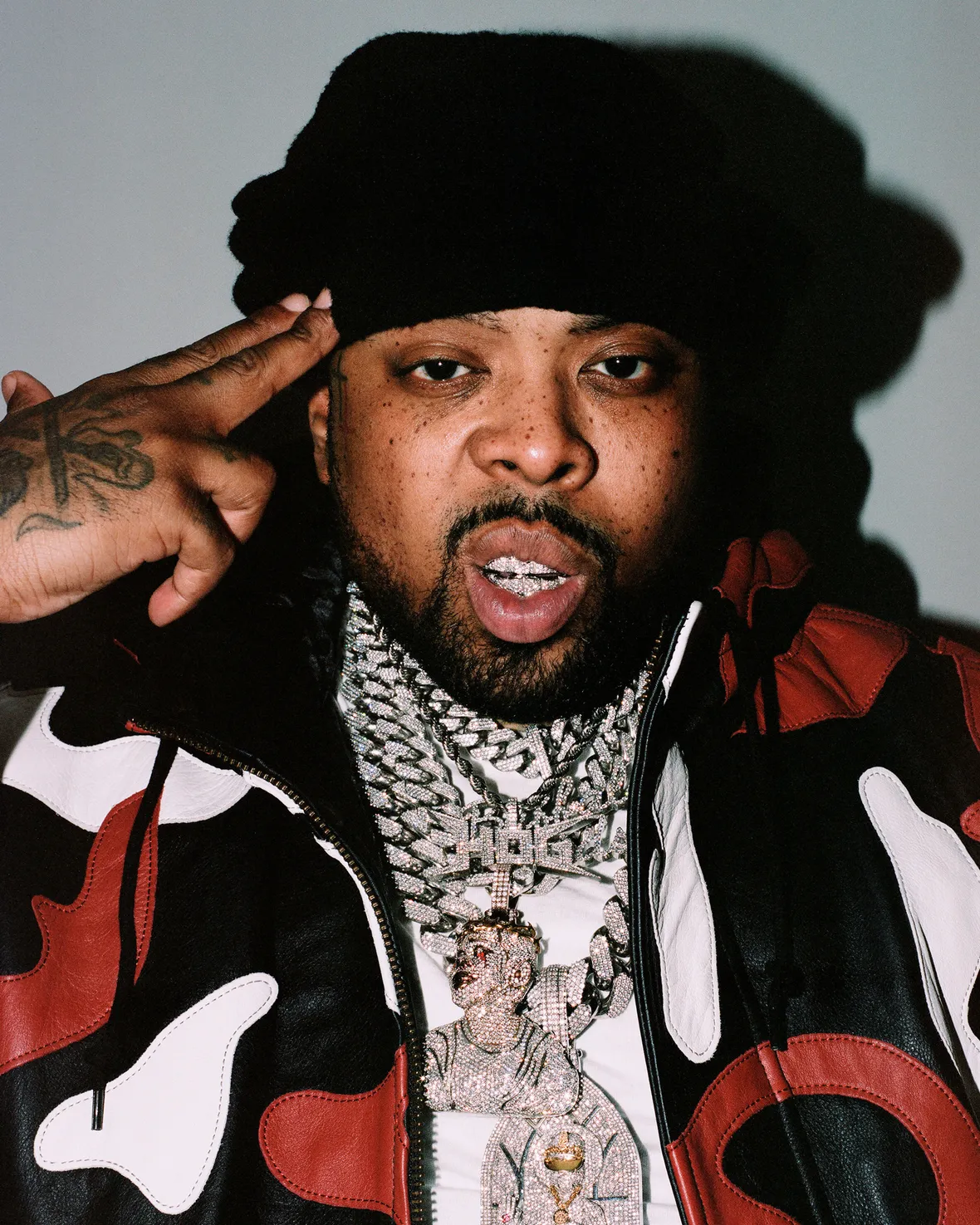 News 197 on now. He wore a black jacket full of multicolored scorpions as his collection of diamond-laced necklaces gleamed off his neck.